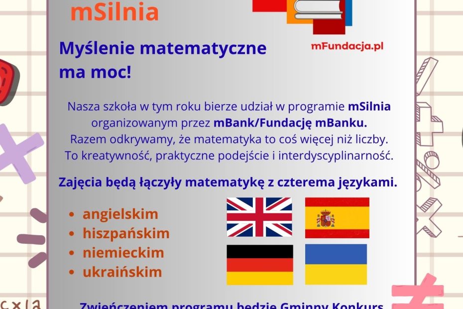 Uczniowie naszej szkoły z klas III–VI aktywnie uczestniczą w wyjątkowym projekcie edukacyjnym „mSilnia”, który w nowoczesny sposób łączy naukę matematyki z nauką języków obcych: angielskiego, niemieckiego, hiszpańskiego oraz ukraińskiego. Zajęcia pełne… Czytaj dalej »Projekt edukacyjny mSilnia