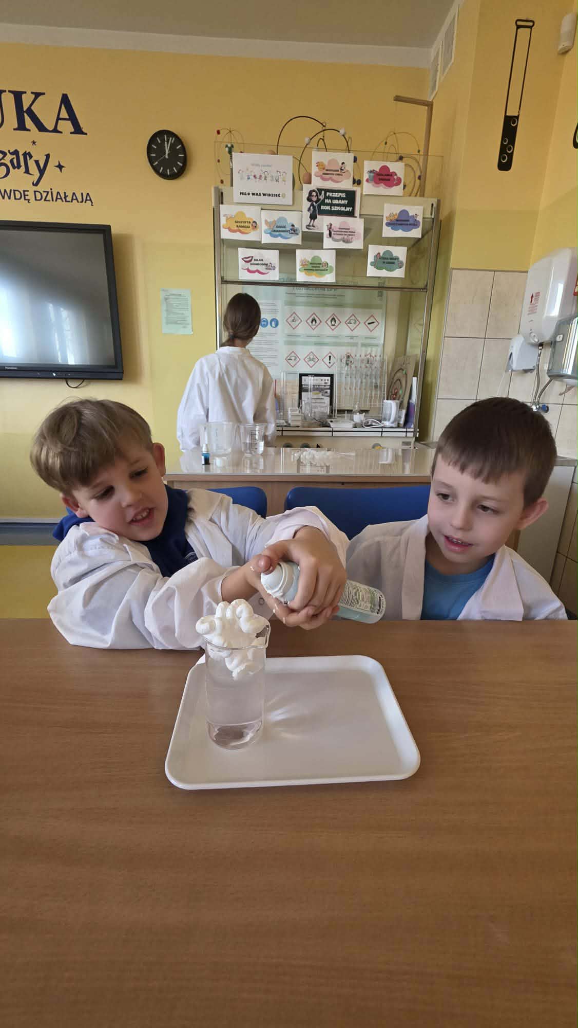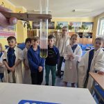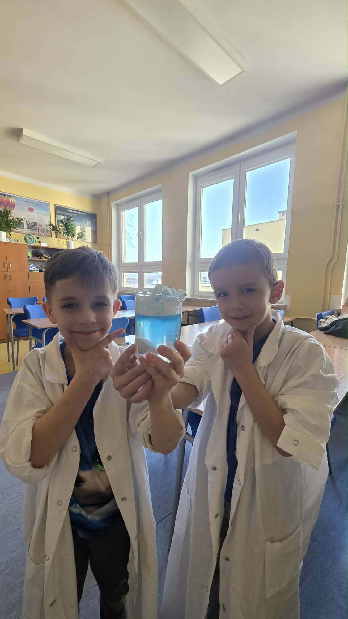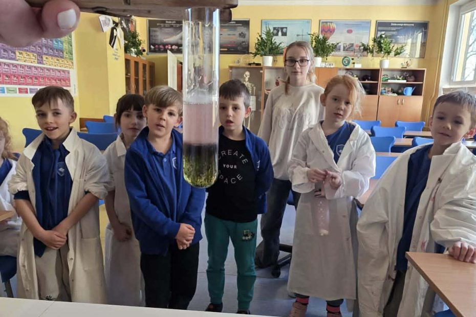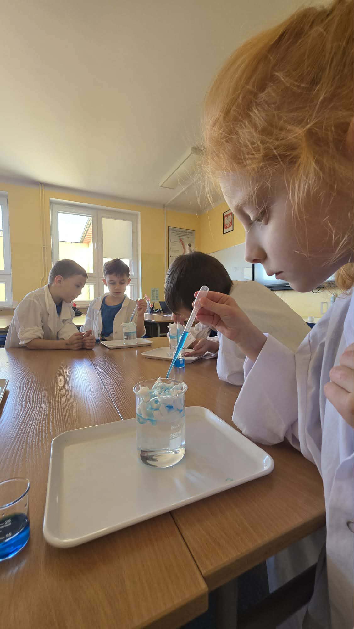 Dzieci zgłębiły również sylwetki wybitnych naukowców: Charlesa Babbage’a, uznawanego za ojca komputerów, oraz Michaela Faradaya, pioniera badań nad elektrycznością. Zdobyta wiedza stała się świetnym wstępem do eksperymentów związanych ze zjawiskami pogodowymi — powstała „burza w probówce” oraz „deszczowa chmurka”. ![]()
