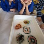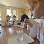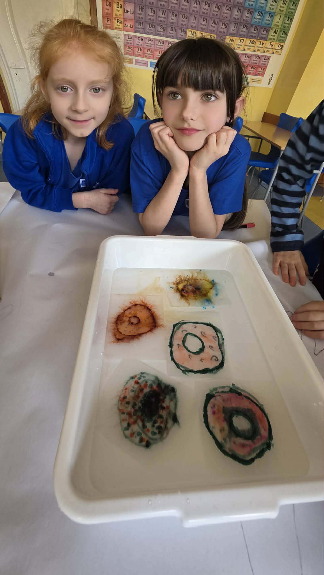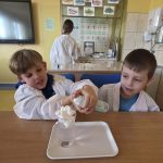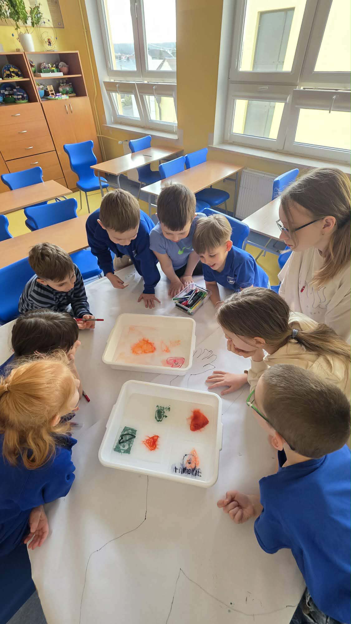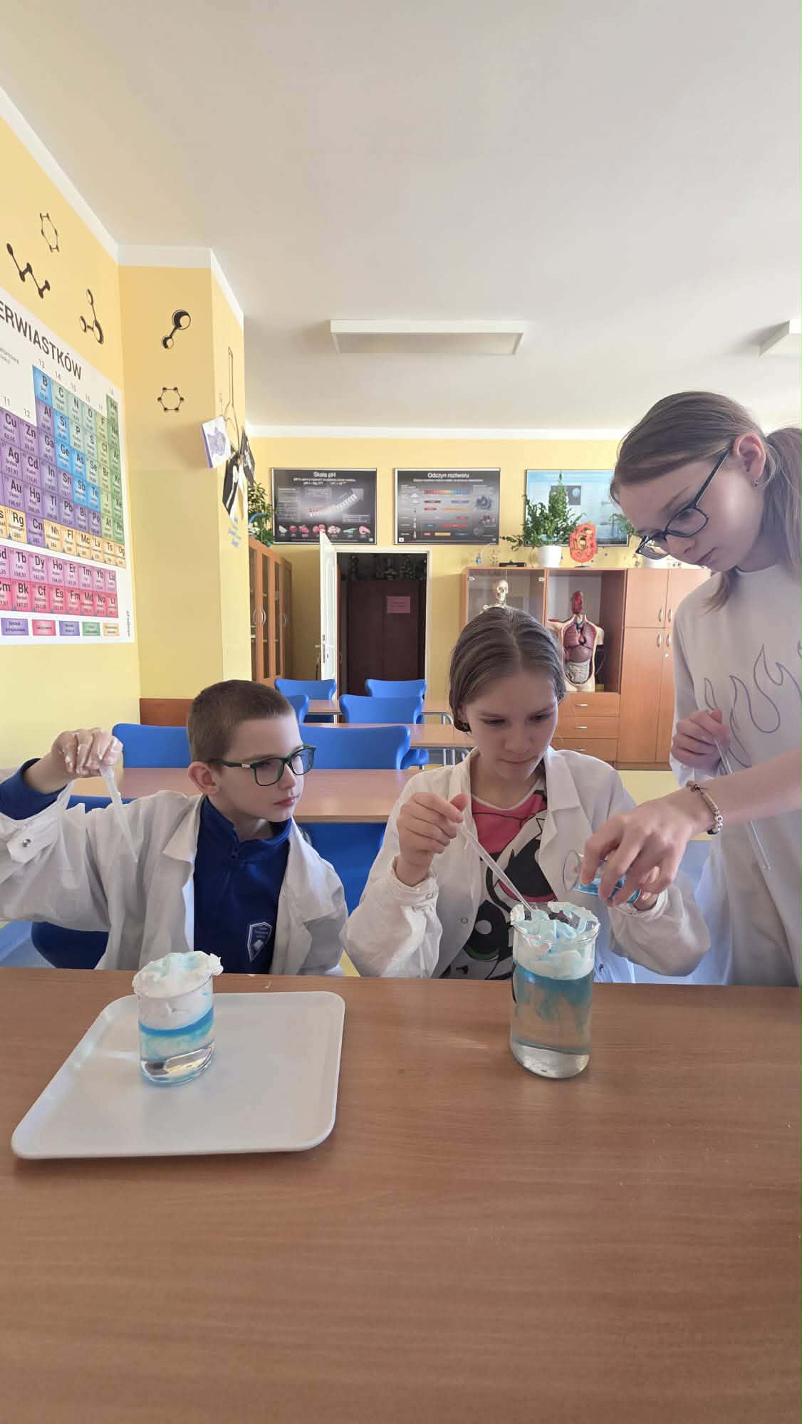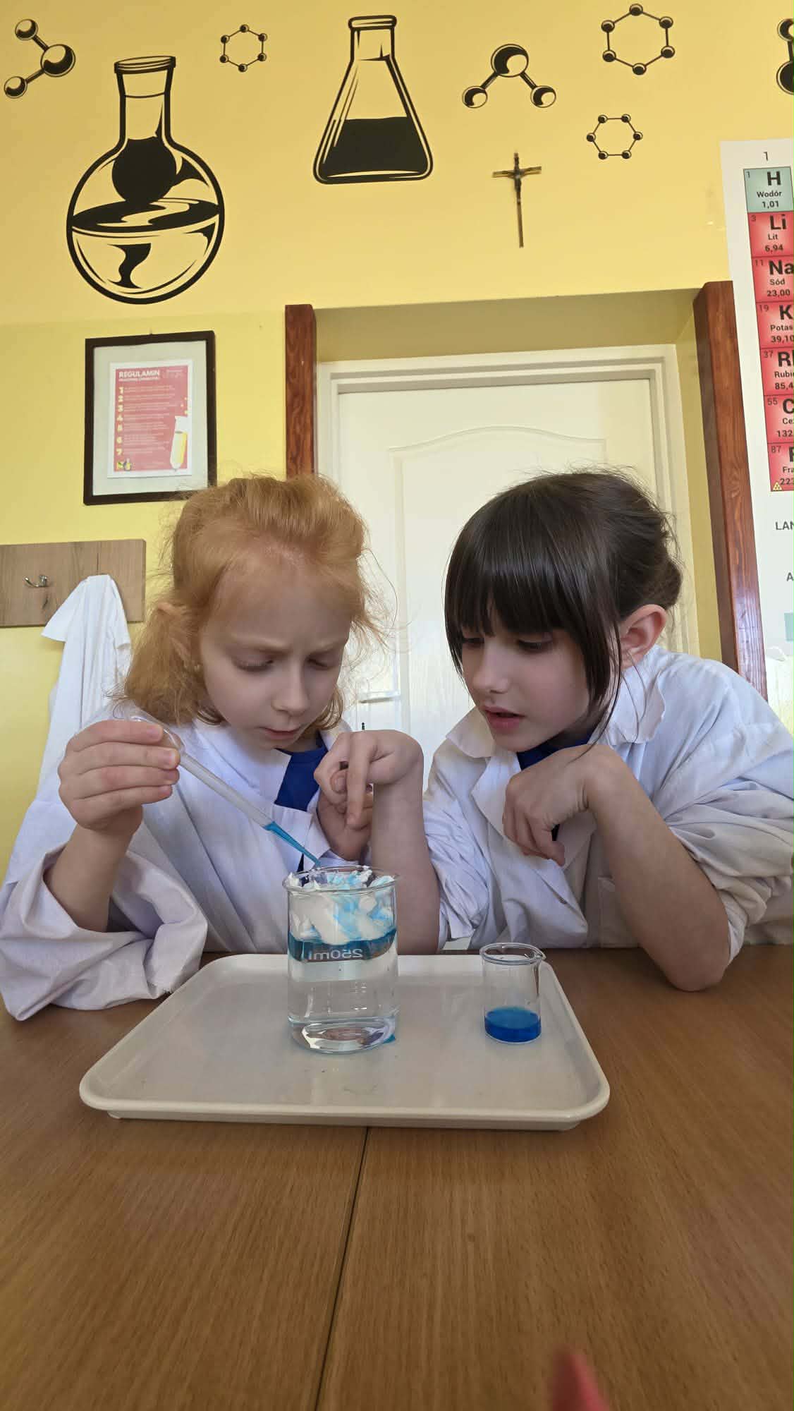 Dzieci zgłębiły również sylwetki wybitnych naukowców: Charlesa Babbage’a, uznawanego za ojca komputerów, oraz Michaela Faradaya, pioniera badań nad elektrycznością. Zdobyta wiedza stała się świetnym wstępem do eksperymentów związanych ze zjawiskami pogodowymi — powstała „burza w probówce” oraz „deszczowa chmurka”. ![]()