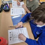 W module piątym i szóstym rysowali drugą część wazonu, analizowali kody liczbowe, odkodowywali figury oraz rozwiązywali test matematyczny, dbając o poprawność zapisu i logiczne myślenie.