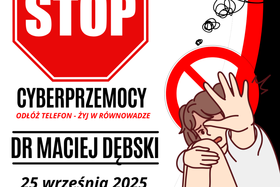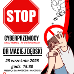 Zapraszamy wszystkich rodziców oraz nauczycieli na prelekcję dotyczącą cyberprzemocy. Prelekcję poprowadzi dr Maciej Dębski – socjolog, ekspert w dziedzinie fonoholizmu, założyciel fundacji „Dbam o mój z@sięg”