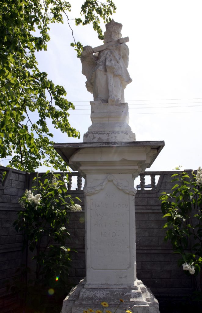 Wykonał ją z piaskowca w 1810 roku nieznany artysta. Na postumencie widnieje lekko już zatarty napis: ,,Na chwałę Bogu Najwyższemu. Anno Domini 1810. Dnia 11 kwietnia wykonane’’. Figurka Nepomucena przetrwała burzliwe dzieje regionu – czasy powstań, dwie wojny światowe, zmiany granic i ustrojów. Nie oszczędził jej tylko czas. Wiatr, mróz i deszcz powoli niszczą strukturę piaskowca, zacierając detale oraz elementy charakterystyczne dla wizerunku św. Jana Nepomucena. Figurka wymaga więc gruntownej i zasłużonej renowacji oraz konserwacji. Warto tu dodać,